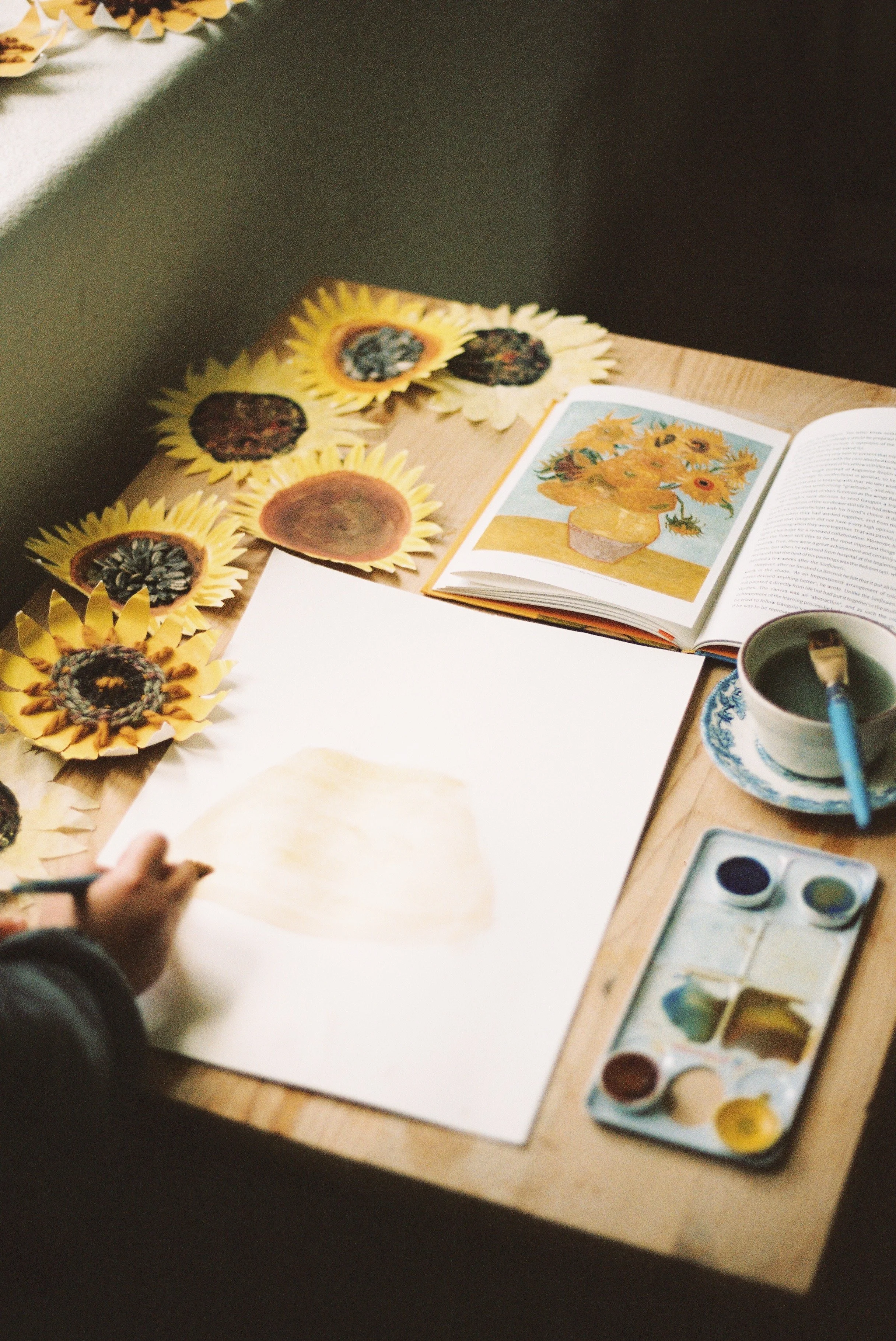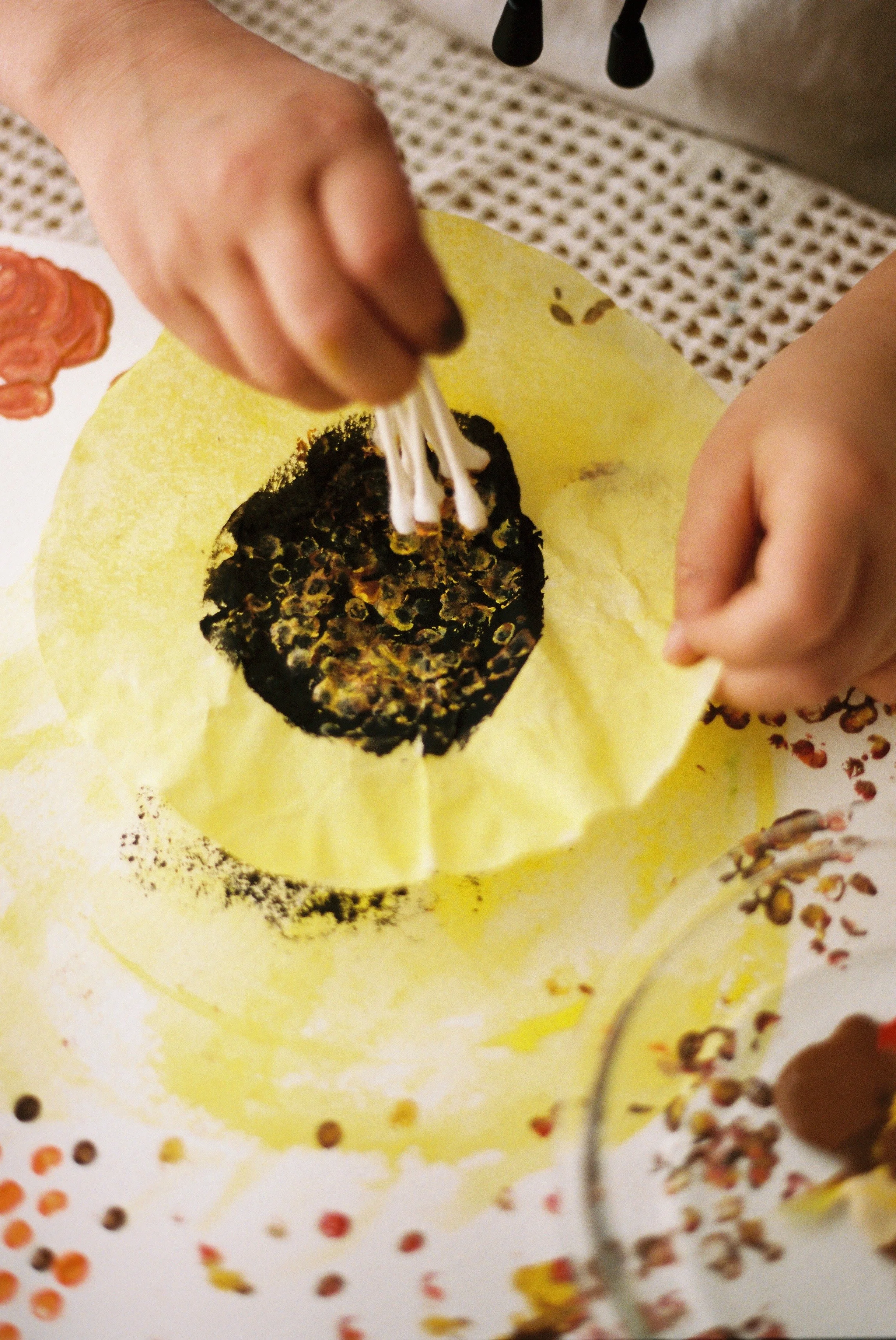 Children participate in the creative process, painting sunflower centers on paper plates and coffee filters.