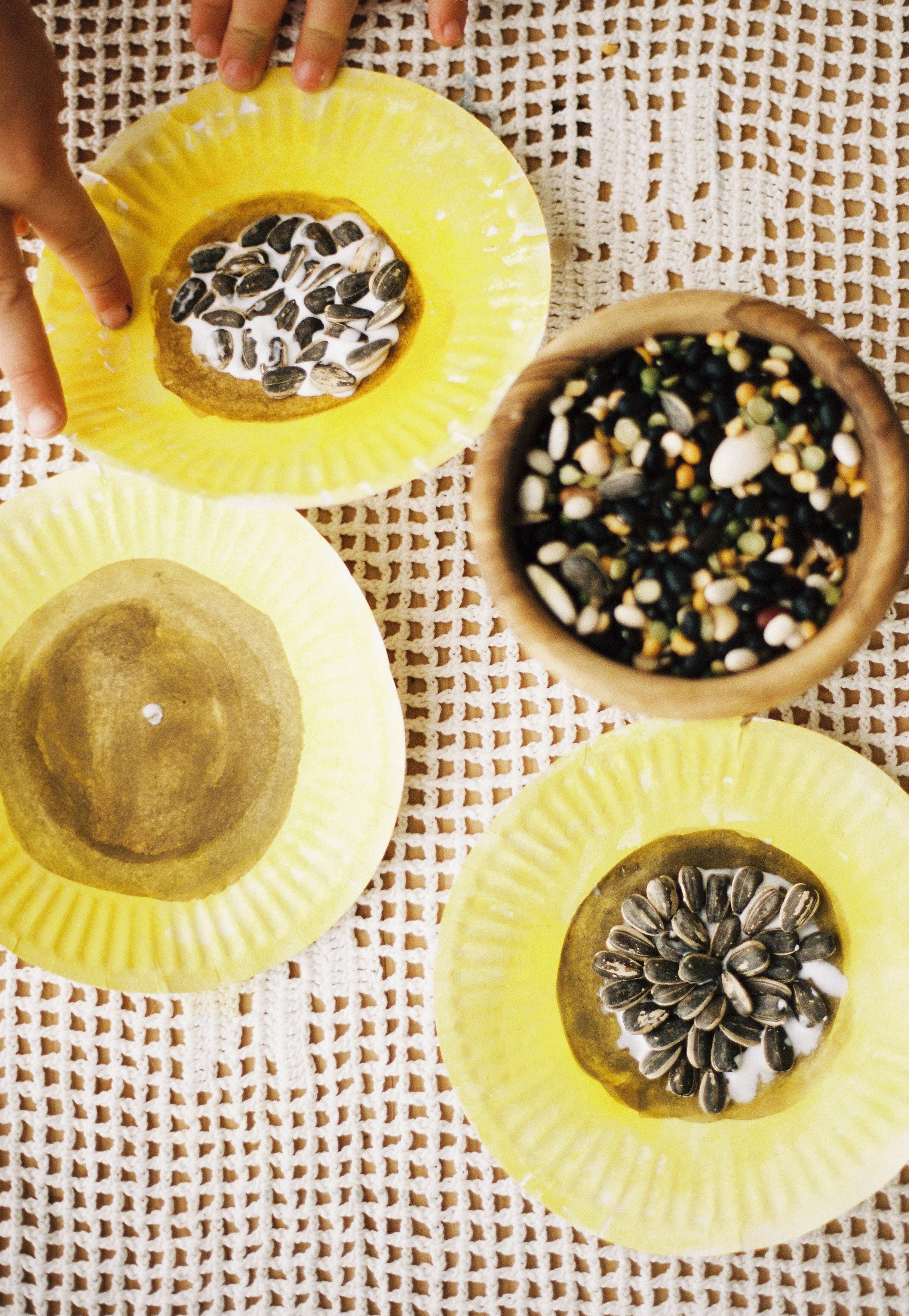 Next we added sunflower seeds using glue to a couple of the paper plates we painted reddish brown. We left one without sunflower seeds for variation.